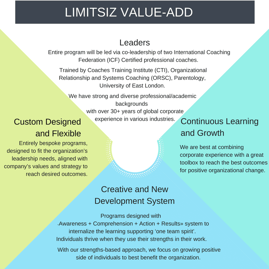 Limitsiz programs are designed anew with evidence-based coaching tools and  positive psychology interventions after identifying the organizations needs. Our TOOLBOX consists of;