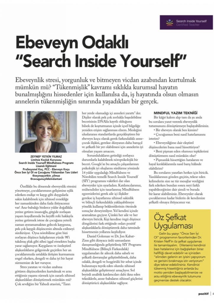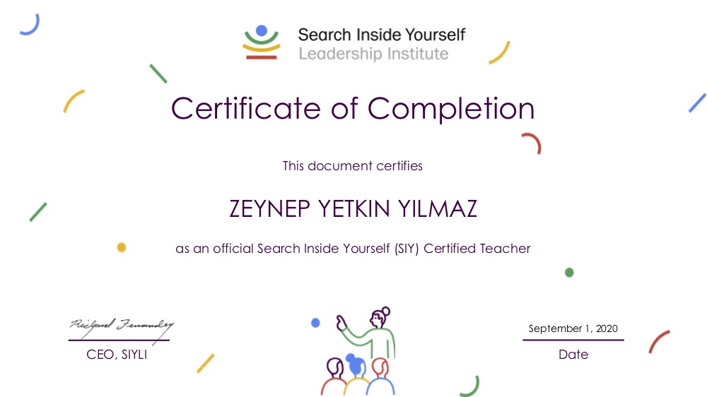 Zeynep’in pozitif dönüşüm ve kaygılarını dindirme yolundaki arayışları onu Google çatısı altında mühendisler için geliştirilen psikoloji ve nörobilim temelli Search Inside Yourself (SIY) Liderlik Enstitüsü Duygusal Zekâ ve Mindfulness Programı ile buluşturdu. Uzun soluklu uluslararası bir eğitim sürecinden sonra SIY liderlik enstitüsünün dünyadaki 700 lisanslı eğitmenlerinden biri olmaya hak kazandı. Bu sayede başta çalışanlar ve ailelerin liderleri anneler olmak üzere, öğretmelerin ve öğrencilerin SIY’in sunduğu pratik ve etkin duygusal zeka tekniklerini hayatlarına dahil etmek için çalışmaya başladı.